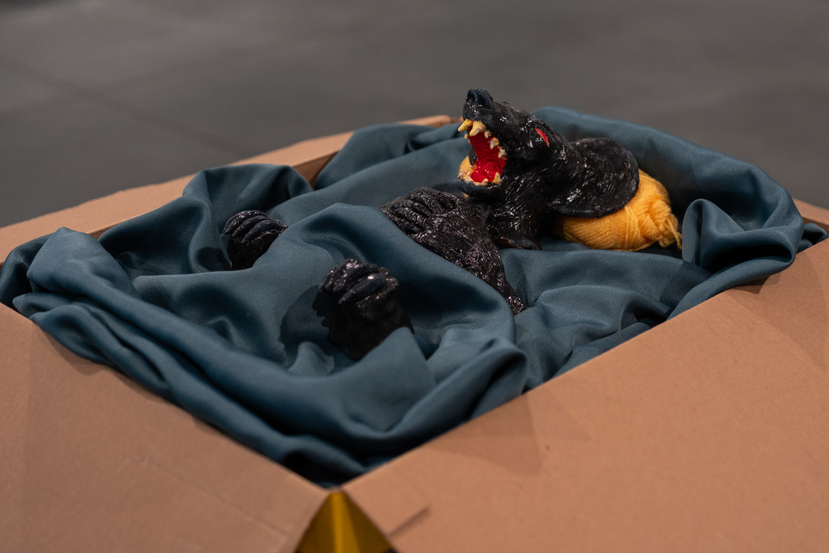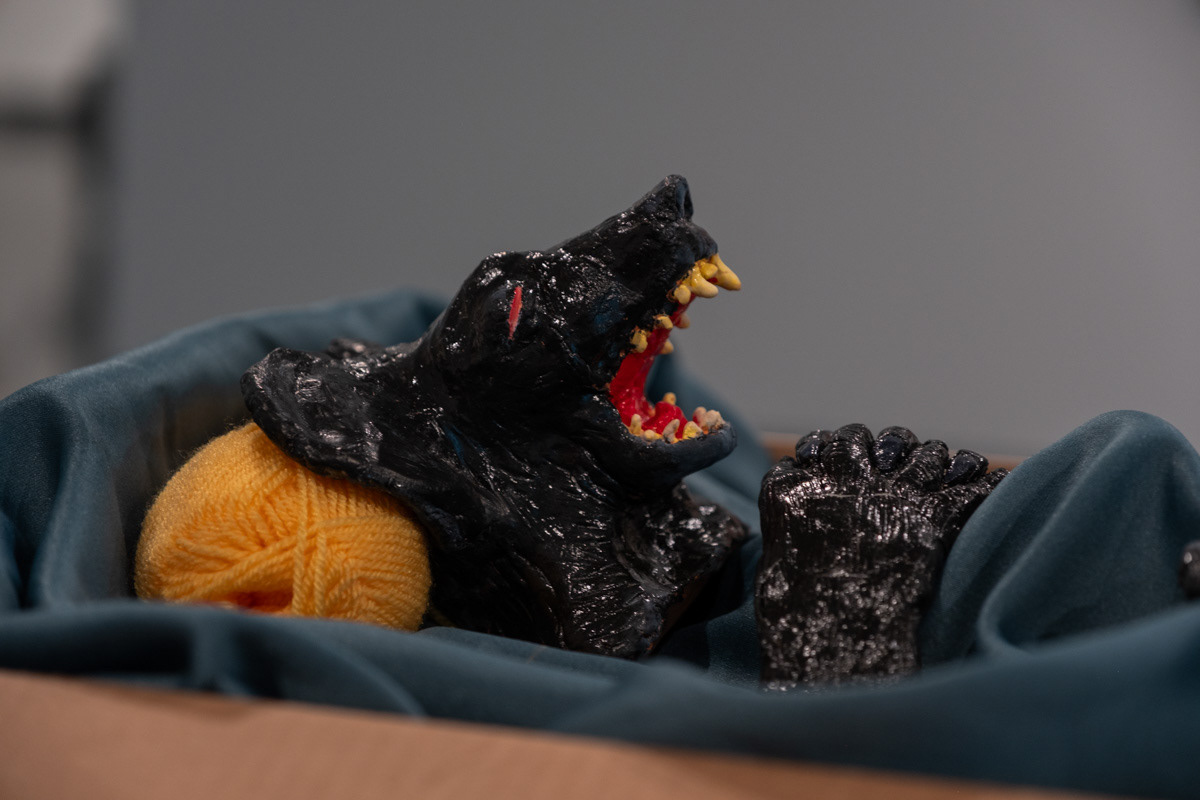 Chapter 36 – The Fox - Acrylic, clay, and found fabric.